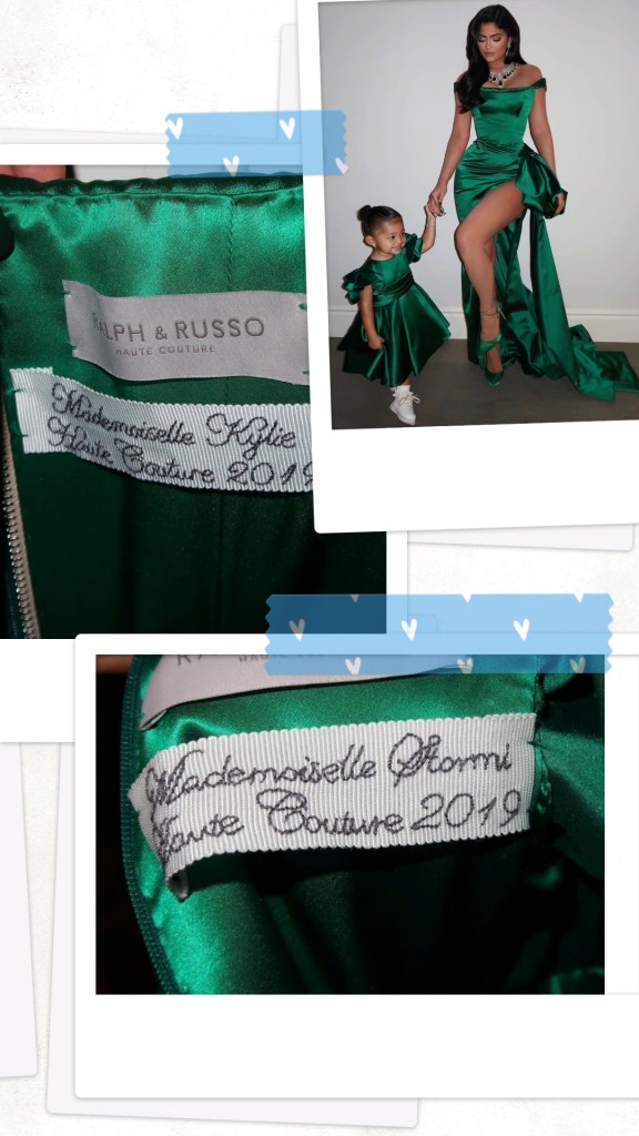 Kyle Jenner and her baby girl Stormi Webster were seen twinning at this year’s Kardashian-West-Jenner Christmas Evey Party, both wearing custom Ralph&Russo emerald green gowns for the special occasion.