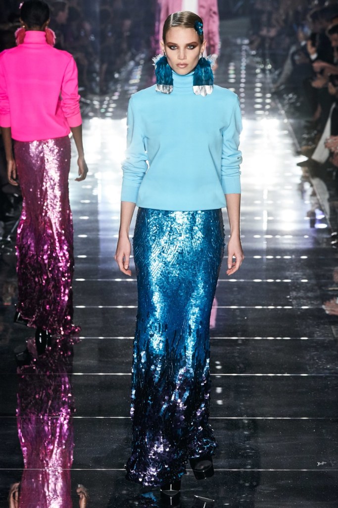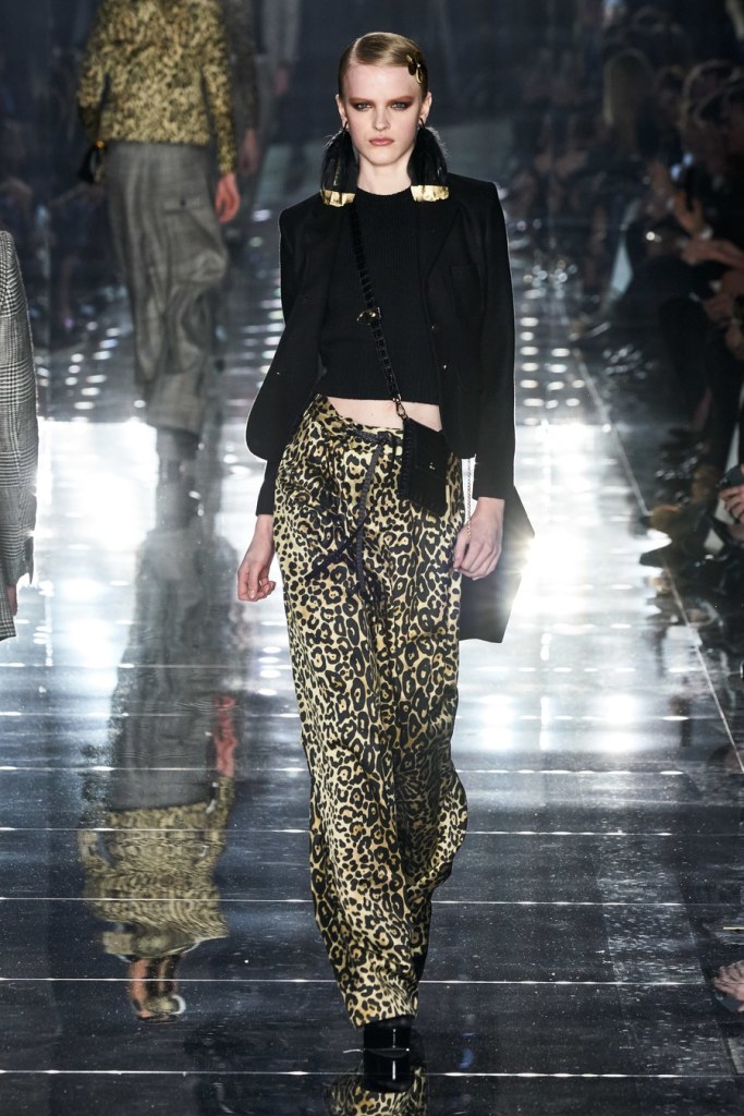 Although most fashion show are in New York this week, Ford took advantage of Oscar weekend to stage a sleek show in the award show’s hometown of Los Angeles with his signature drama, using bright colors and rich texture like velvet and shearling.