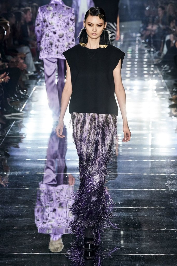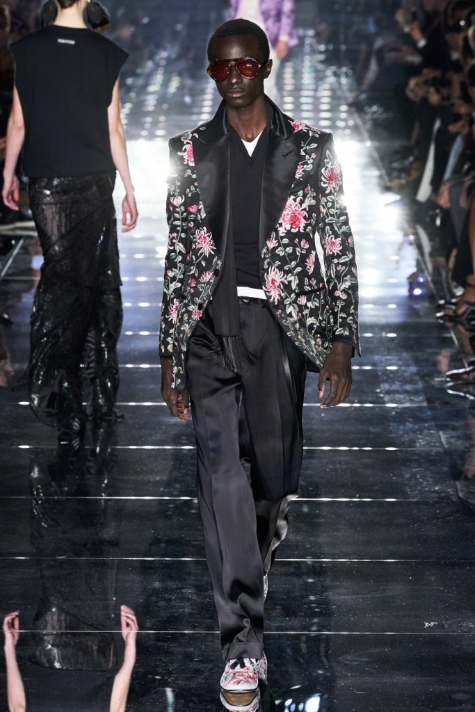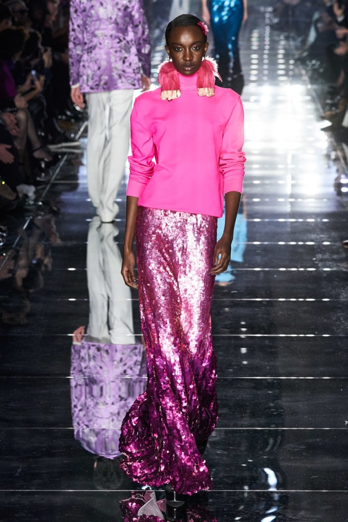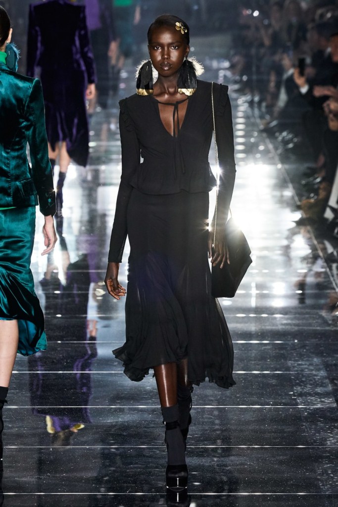 While black often dominated Ford shows, bright colors at the Fall 2020 show stunned onlookers including a men’s red casual jacket paired with silk pink satin pants, sweaters in emerald green and dresses in deep purple. Every female model’s hair was in the same sleek tight bun, accessorized with flowers made of feathers.
