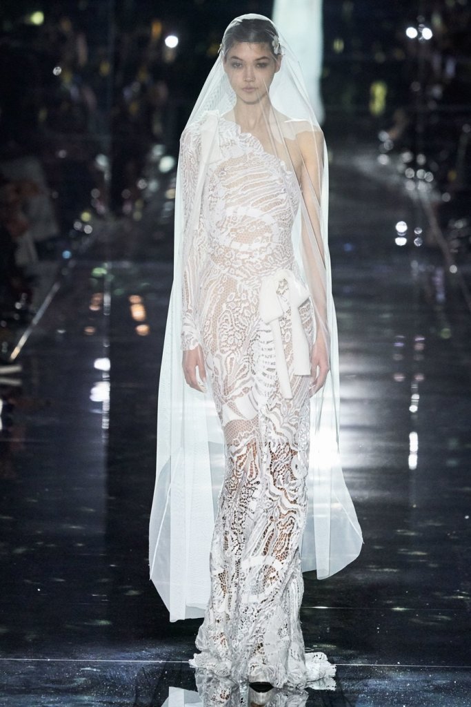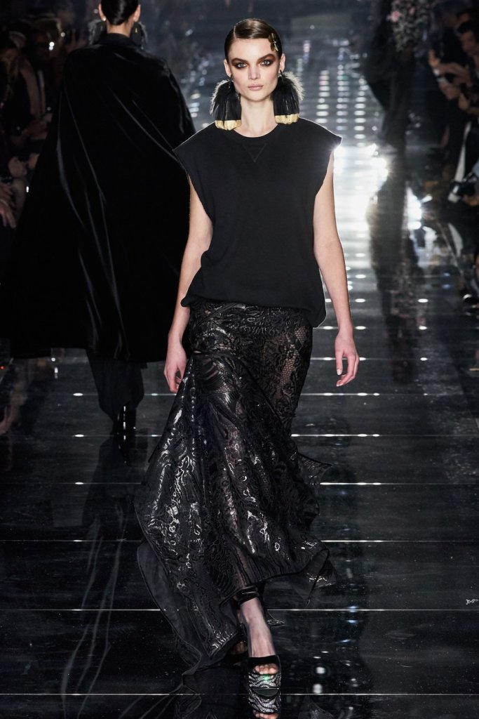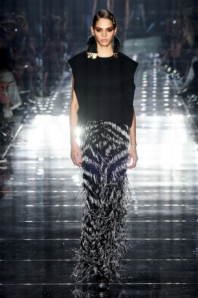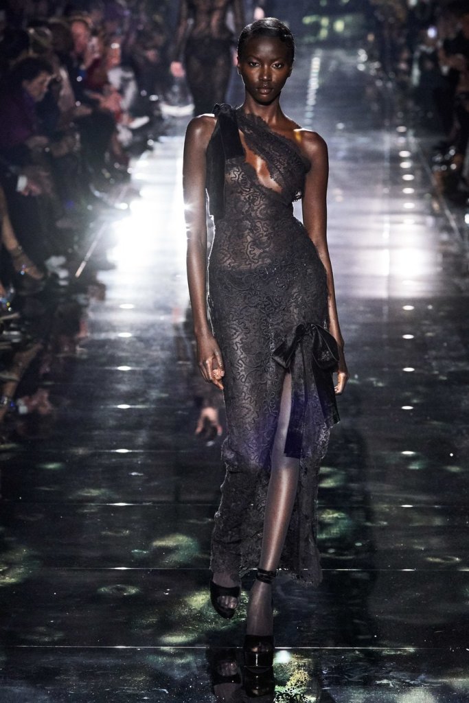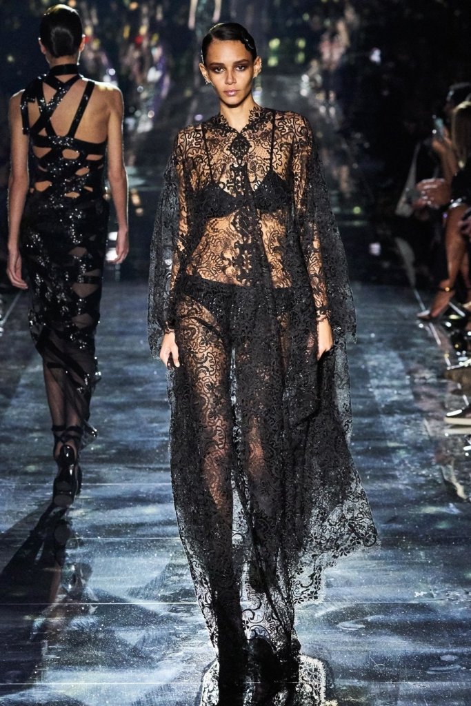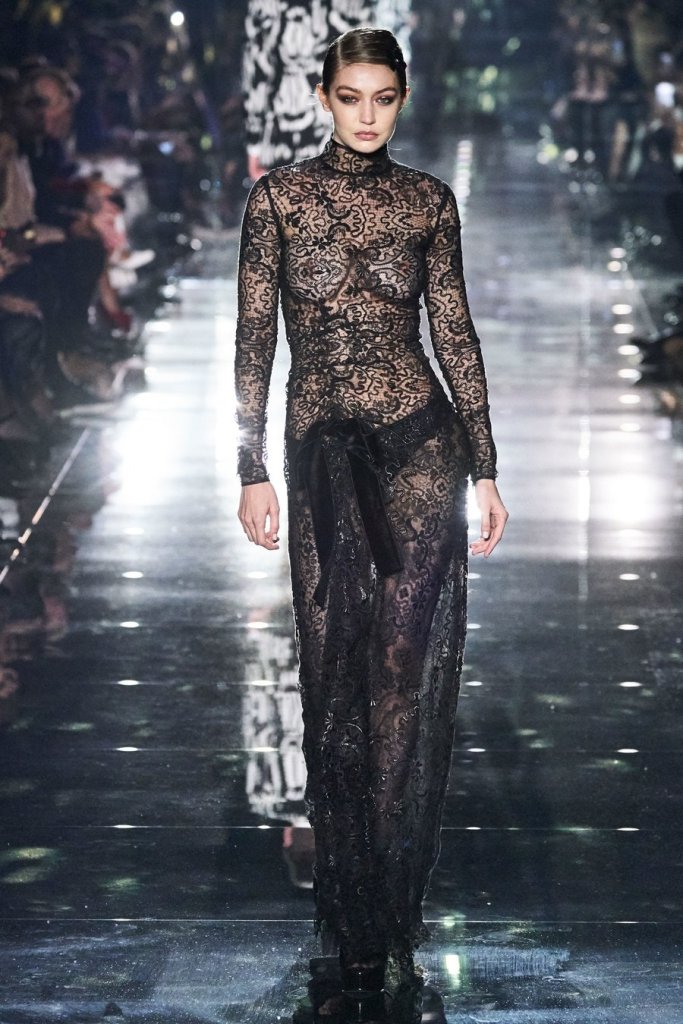 Halfway through the show, the lights went down and disco balls descended from the ceiling, creating spinning bounces of light and setting the tone for evening wear. The crowd hooted as Bella Hadid entered in a s sleek silver sequined peekaboo dress with dramatic black velvet bows. Several of the looks to follow were fitted diaphanous gowns of ornate black lace that revealed black undergarments beneath. The men’s tuxedo jackets had bold prints over black pants.