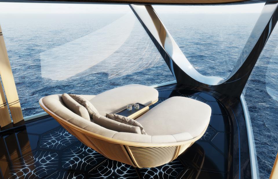 The indoor health & wellness center is designed with a hydro massage room, a yoga space and workout floor and a massive, gym-wide door in the hull which opens to reveal the ocean’s surface at water level.
