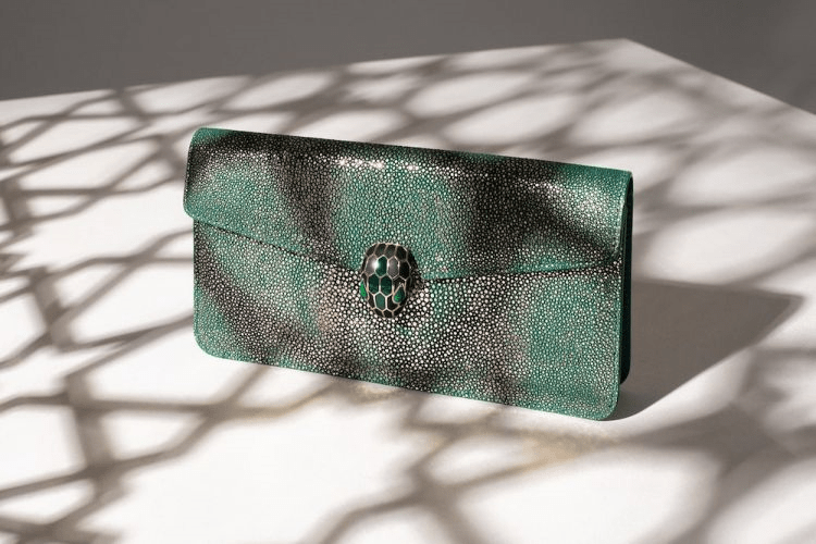 Renowned for making her own rules instead of playing anyone else’s, a true fashionista refuses to conform to society’s trends and is proud to let her individualism reign free, such as with this special edition golden emerald crystal galuchat skin shoulder bag that exudes grace and charisma