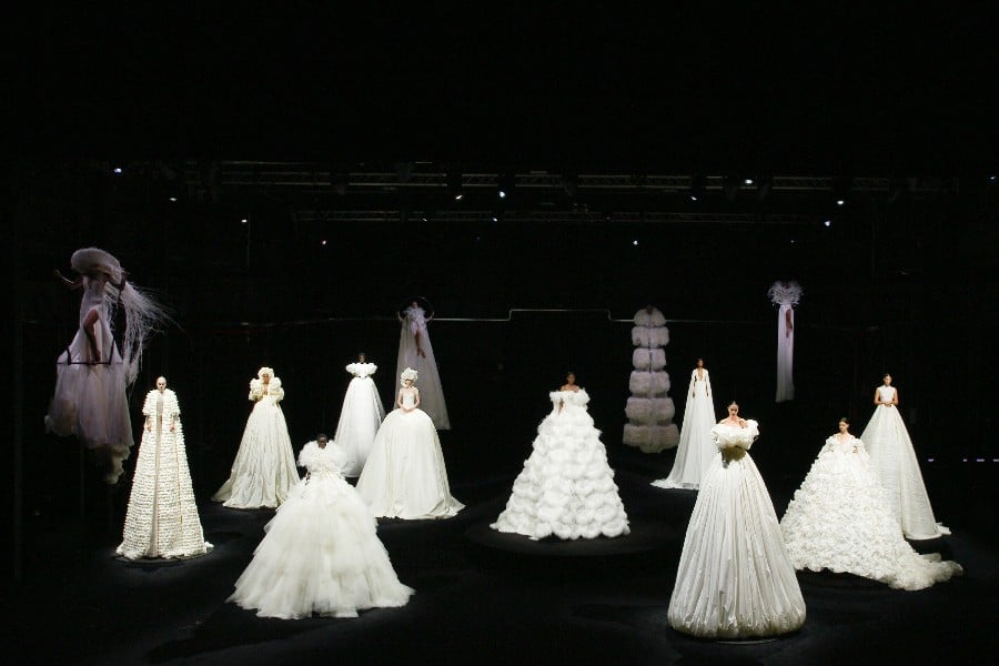 It displayed 15 gowns, all pure white but for one with silver fringes, with cascades of feathers, ruffles, chiffon and taffeta. Some were four or five metres long, to showcase the painstaking work in creating them. In some cases, up to 4,000 hours of stitching by hand and 350 metres of fabric were needed.