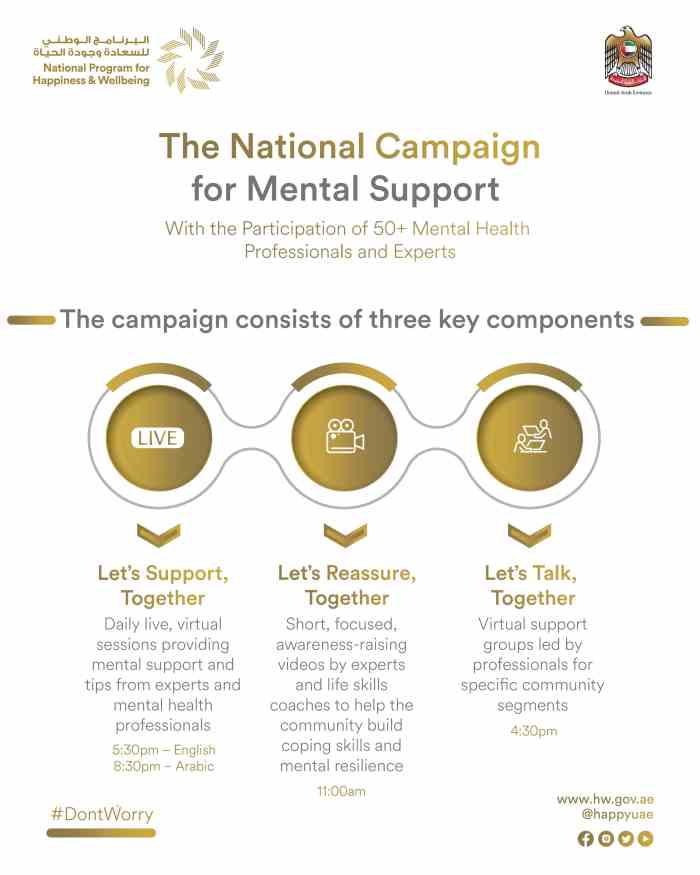 ABU DHABI – The National Programme for Happiness and Wellbeing, NPHW, has launched a national campaign for mental support for all UAE residents to help them overcome the psychological impact resulting from the spread of COVID-19. More than 50 experts in the field of psychology, mental and social support, and life skills are participating in … Continue reading MENTAL HEALTH | UAE Launches Online Campaign For Mental Support Amid Coronavirus Outbreak